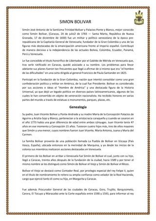 Simón Bolívar fue un militar y político venezolano que lideró las guerras de independencia contra el Imperio español en América del Sur. Nació en Caracas en 1783 y provenía de una familia aristocrática. Recibió una educación deficiente debido a problemas familiares. Más tarde se casó con María Teresa Rodríguez en 1802 y lideró las campañas que lograron la independencia de Venezuela, Colombia, Ecuador, Perú y Bolivia entre 1811 a 1825. Fue presidente de la Gran Colombia entre 1819 a 1830.