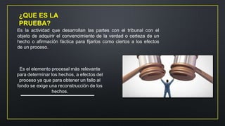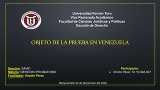 Este documento trata sobre el objeto de la prueba en Venezuela. Define la prueba como la actividad que desarrollan las partes con el tribunal para establecer la verdad de los hechos de un caso. Explica que la prueba y los medios de prueba son diferentes, y que el objeto de la prueba son los hechos relevantes al caso. También discute varios tipos de hechos, incluyendo hechos controvertidos, hechos que no requieren prueba, y el objeto general de la prueba en los procesos leg