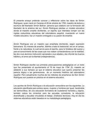 Este documento resume las ideas y obra del educador venezolano Simón Rodríguez. Fue maestro de Simón Bolívar y propuso un modelo educativo donde el maestro enseñara divirtiendo. Rodríguez criticó el sistema educativo colonial y propuso uno basado en la igualdad, la educación general y el pensamiento crítico. Abogó por una educación para ambos sexos y por formar ciudadanos honestos. Sus ideas influyeron en los sistemas educativos de América Latina.