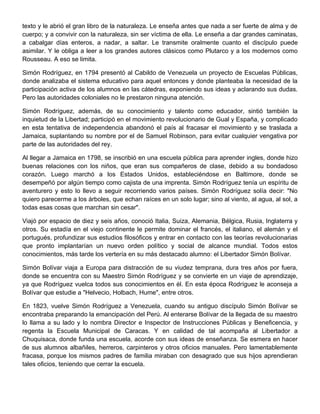 Simón Rodríguez nació en Caracas en 1771. Fue maestro de Simón Bolívar y tuvo una gran influencia en su formación y en su pensamiento libertario. Rodríguez enseñaba de una manera no tradicional, llevando a sus alumnos al campo para que aprendieran de la naturaleza. Acompañó a Bolívar en su viaje a Europa y le transmitió sus amplios conocimientos. Rodríguez dedicó su vida a la enseñanza y la lucha por la libertad en varios países de América.
