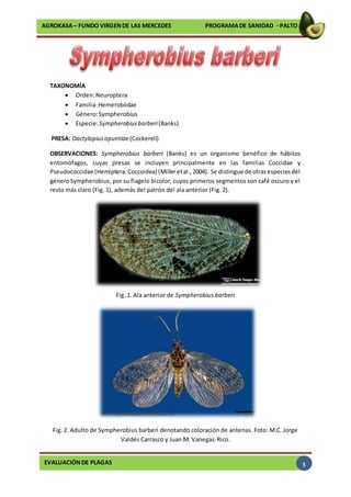 Sympherobius barberi es un depredador benéfico que se alimenta principalmente de la familia Coccidae, incluida la plaga Dactylopius opuntiae. S. barberi se distingue por sus antenas bicolores y el patrón de sus alas. Tiene un ciclo de vida que incluye huevo, tres etapas larvales, pupa y adulto, completándose en 28 días. Se distribuye desde Perú hasta Hawái y en varios estados de México, donde se alimenta de plagas como D. opuntiae