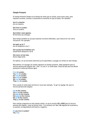El documento explica el uso del tiempo presente simple en inglés. Se utiliza para acciones habituales o situaciones actuales. Los verbos regulares agregan "s" en la tercera persona singular, mientras que los verbos que terminan en vocal agregan "es". Las preguntas se forman con el auxiliar "do" o "does" y se responden con frases completas.