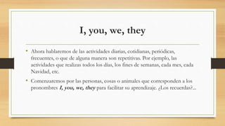 Este documento proporciona una introducción al uso del presente simple en inglés. Explica los pronombres personales "I, you, we, they" y proporciona ejemplos de verbos comunes. A continuación, muestra oraciones de ejemplo en presente simple que describen actividades diarias utilizando los pronombres y verbos introducidos. Finalmente, resume los usos principales del presente simple, incluido describir horarios, hábitos y hechos universales.