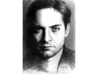Este documento presenta los retratos realizados con lápiz de grafito por la artista Linda Huber. Huber, de 49 años y residente en Nueva York, se ha especializado en dibujos realistas utilizando solo lápices durante más de 30 años. Los detalles y la paciencia son clave para lograr el máximo realismo en sus retratos de actores y cantantes famosos.