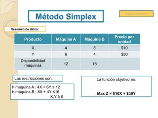 Este documento presenta un problema de programación lineal para maximizar las ganancias de una empresa química que produce dos productos (X e Y) usando dos máquinas (A y B) con capacidades limitadas. El resumen es: