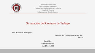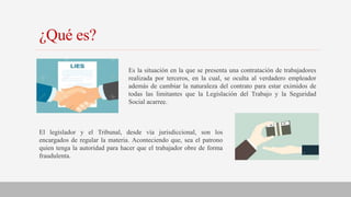 El documento aborda la simulación de contratos de trabajo en Venezuela, destacando cómo los empleadores eluden obligaciones laborales para reducir costos y aumentar ganancias, lo que cambia la naturaleza del contrato. Se describen las causas y efectos de este fraude, además de las implicaciones legales para los trabajadores, quienes pueden encontrar protección a través de principios jurídicos como la irrenunciabilidad de las normas laborales y la presunción laboral. También se mencionan figuras jurídicas utilizadas en estos fraudes, como el contrato de obra y el mandato, así como la necesidad de que la legislación y la jurisprudencia prevengan estas prácticas.
