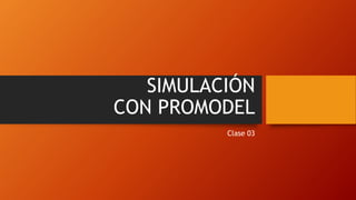 El documento describe el uso del software de simulación ProModel. Explica que ProModel se puede utilizar para simular procesos de fabricación, líneas de ensamble y sistemas de servicios. A continuación, presenta un ejemplo de simulación de una prensa que procesa piezas que llegan cada 5 minutos de forma aleatoria y tarda 4 minutos en procesar cada pieza. El objetivo es simular el proceso durante 100 días.