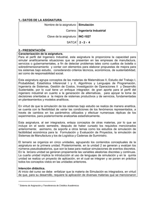 La asignatura Simulación es para estudiantes de ingeniería industrial. Enseña habilidades de simulación analítica para detectar problemas en sistemas de producción, servicios o gubernamentales y proponer mejoras considerando factores técnicos, económicos y sociales. Integra conceptos de matemáticas, probabilidad, estadística, programación y otras materias. El curso cubre generación de números aleatorios, variables discretas y continuas, uso de simuladores y un proyecto final integrando todos los conceptos.
