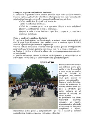 El documento compara y contrasta las simulaciones y simulacros como técnicas de capacitación y evaluación de planes de emergencia. Una simulación es un ejercicio parcial en un salón de clases que entrena a brigadistas en la toma de decisiones, mientras que un simulacro representa completamente una emergencia en el terreno para evaluar la ejecución del plan de respuesta. Ambos métodos contribuyen a la preparación y respuesta ante desastres a través de la educación en gestión de riesgos.