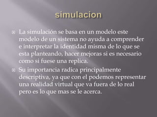 La simulación se basa en un modelo que ayuda a comprender e interpretar la identidad de lo que se está planteando y hacer mejoras si es necesario. Su importancia radica principalmente en que permite representar una realidad virtual que se acerca a lo real. La simulación está revolucionando la era de la informática al permitir entender el comportamiento de sistemas y predecir el futuro basado en este comportamiento. Existen diferentes tipos de simulación como física, analógica, de juegos administrativos y matemática.