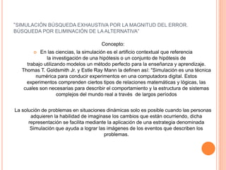 Este documento describe dos estrategias de simulación para resolver problemas: la búsqueda exhaustiva por la magnitud del error y la búsqueda por eliminación de alternativas. La búsqueda exhaustiva involucra probar alternativas de solución sistemáticamente hasta encontrar una que minimice el error con la solución esperada. La búsqueda por eliminación implica revisar todas las alternativas y descartar aquellas que no satisfacen las condiciones del problema hasta identificar la solución correcta. El objetivo es aplicar estas estrategias para resolver