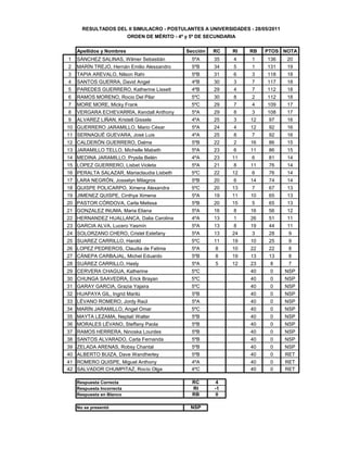 El resumen presenta los resultados del segundo simulacro para postulantes a universidades del 28 de mayo de 2011. Muestra el orden de mérito de los estudiantes de 4o y 5o de secundaria, con sus nombres, sección, puntaje obtenido en las respuestas correctas, incorrectas y en blanco, así como su nota final. El primer puesto fue para Wilmer Sebastián Sánchez Salinas de 5oA con un puntaje de 136 puntos y nota 20. El último puesto fue compartido por 4 estudiantes que no se presentaron a la prueba y 2 estudiantes ret