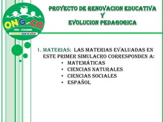 El documento describe un primer simulacro realizado en septiembre de 2011 en la Institución Educativa Adolfo Hoyos en Manizales, Caldas, Colombia como parte de un Proyecto de Renovación Educativa y Evolución Pedagógica. El simulacro evaluó a estudiantes de sexto y séptimo grado en las materias de matemáticas, ciencias naturales, ciencias sociales y español.