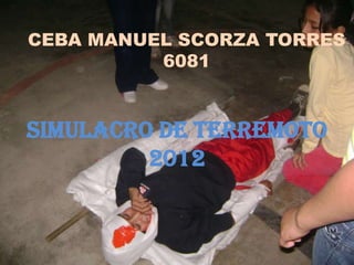 El documento contiene el nombre "CEBA MANUEL SCORZA TORRES" y un número "6081", así como las palabras "Simulacro de terremoto" y el año "2012", lo que sugiere que se trata de un registro de una persona que participó en un simulacro de terremoto en el año 2012.