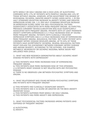 2. Se analiza la relación entre síntomas psiquiátricos y episodios frecuentes de angina en pacientes con enfermedad cardiaca isquémica. Aquellos con ansiedad o depresión tienen un mayor riesgo de angina frecuente.