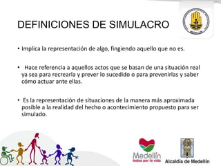 Los simulacros implican representar situaciones de emergencia de manera controlada para evaluar la efectividad de los planes y procedimientos. Deben ser planeados y responder a un plan de emergencias, con el objetivo de evaluar la preparación, los recursos, los planes y los procedimientos, no para descrestar. Las simulaciones son simulaciones académicas de bajo riesgo, mientras que los simulacros deben realizarse periódicamente antes de que ocurra una emergencia real.