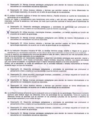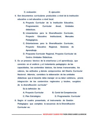 El documento presenta un cuestionario sobre temas pedagógicos con 28 preguntas de opción múltiple. Aborda conceptos como estilos de aprendizaje, metacognición, planificación, evaluación, diversificación curricular, problemas de aprendizaje, y uso de materiales educativos. El cuestionario parece diseñado para evaluar conocimientos básicos sobre estos temas relevantes para la práctica docente.