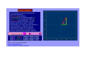El documento explica las funciones trigonométricas sen, cos y tan a través de un triángulo rectángulo con ángulo θ, cateto opuesto c.o., cateto adyacente c.a. y hipotenusa h=1. Se puede cambiar el valor de θ para observar cómo cambian los valores de las funciones trigonométricas en relación con la gráfica del triángulo.