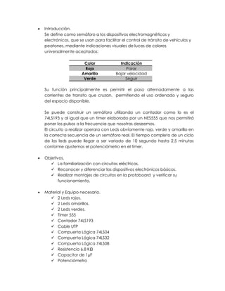 El documento describe la práctica de laboratorio sobre la construcción de un semáforo utilizando componentes electrónicos como el timer 555 y el contador 74LS193. Se detallan los objetivos de familiarización con circuitos eléctricos, los materiales necesarios, y el desarrollo del montaje y funcionamiento del circuito. Finalmente, se concluye que la actividad permite comprender mejor el funcionamiento del semáforo y los componentes utilizados en él.