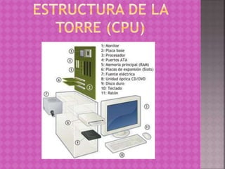 El documento describe los componentes principales de una computadora, incluyendo la placa base, la CPU, la tarjeta de video, la memoria RAM, las unidades de almacenamiento como el disco duro, y periféricos como el teclado, mouse y monitor.