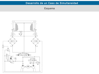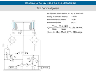 1) El documento describe el desarrollo de un caso de simultaneidad con dos bombas, dos cilindros, dos reguladores de caudal y otros componentes. 2) Incluye cálculos de caudales, velocidades, presiones y potencias involucradas en los movimientos de salida y entrada de los vástagos de los cilindros. 3) El análisis considera casos con cargas desiguales en los cilindros y también sin carga.