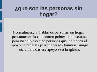 El documento habla sobre las personas sin hogar y dos organizaciones que los ayudan: Cáritas y el Albergue de San Vicente de Paul. Explica que Cáritas ofrece alojamiento temporal, formación profesional y apoyo a niños y ancianos, mientras que el Albergue de San Vicente de Paul brinda cobijo de hasta 6 meses e inserción laboral. También menciona algunas estadísticas sobre las personas sin hogar y cómo estas organizaciones reciben donaciones de alimentos y fondos.