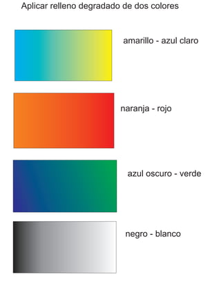 El documento proporciona instrucciones para aplicar rellenos degradados de dos colores en proyectos de arte o manualidades. Sugiere combinaciones de colores como amarillo-azul claro, naranja-rojo, azul oscuro-verde y negro-blanco.