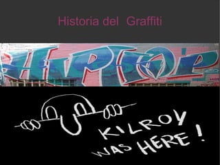 El documento resume la historia del graffiti desde sus orígenes en la década de 1960 en Nueva York hasta su evolución como arte urbano. Comenzó como tags escritos por adolescentes para marcar su territorio y luego se popularizó entre grupos políticos para transmitir mensajes. A finales de los años 60, los primeros grafiteros de Nueva York comenzaron a añadir números a sus nombres para indicar su dirección. Más tarde, en los años 80, el graffiti se extendió a otras ciudades como parte de la cultura hip hop y ha continuado