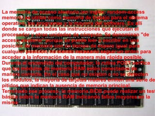 Este documento describe los tipos principales de memoria en computadoras. La memoria de acceso aleatorio (RAM) se utiliza como memoria de trabajo y almacena instrucciones para el procesador, permitiendo acceder a cualquier posición de datos en el mismo tiempo. Durante el encendido, la prueba POST verifica que los módulos de RAM estén conectados correctamente y puede realizar pruebas básicas de la memoria. La RAM se refiere específicamente a los módulos de memoria en computadoras, aunque otras memorias como las ROM y