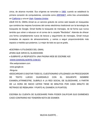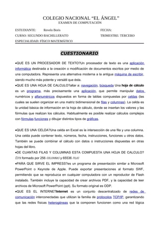 Este documento presenta un examen de computación para un estudiante de segundo año de bachillerato especializado en física y matemáticas. El examen contiene preguntas sobre procesadores de texto, hojas de cálculo, celdas, Impress, Internet, Gmail y SlideShare. Se instruye al estudiante a descargar el cuestionario en un procesador de texto, subirlo a SlideShare dentro de una hora y proveer su cuenta de SlideShare para calificar el examen.