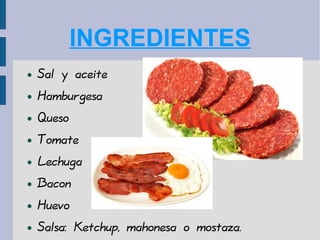 Este documento describe cómo cocinar una hamburguesa completa en 20 minutos. Explica los ingredientes necesarios como carne, queso, tomate, lechuga y salsa. Detalla los pasos de la preparación como freír la hamburguesa y el bacon y hacer un huevo frito. También menciona diferentes tipos de hamburguesas como la española, argentina o mexicana. Por último, brinda una breve historia sobre el origen de la hamburguesa en las tribus mongolas y turcas del siglo XIV.