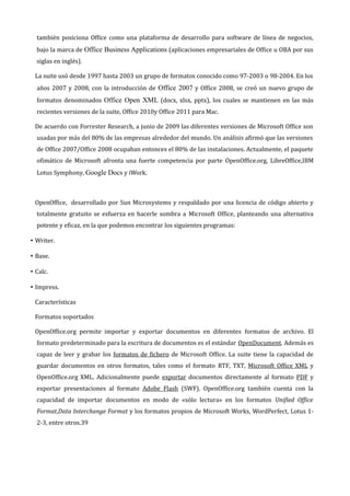 Nixon Hurtado consulta sobre las diferencias entre Open Office y Microsoft Office. Open Office es una suite de oficina de código abierto gratuita que incluye programas como Writer, Calc, Impress y Base, y puede leer y escribir formatos de Microsoft Office. Microsoft Office es una suite de pago que incluye Word, Excel, PowerPoint y Access, y es utilizada por más del 80% de las empresas. Ambas suites permiten la creación y edición de documentos, hojas de cálculo y presentaciones.