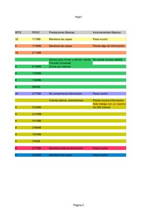 El documento presenta una tabla comparativa de los formatos de archivo más comunes (PSD, PNG, JPG, BMP, GIF, RAW y TIFF) utilizados en edición de imágenes. Describe las características de compresión, resolución, dimensiones, medidas, canales de color y ventajas e inconvenientes básicos de cada formato.