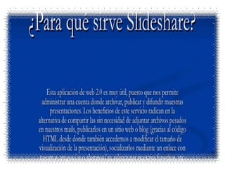 El documento proporciona instrucciones en 7 pasos para subir archivos a la plataforma SlideShare. Estos incluyen abrir una cuenta en SlideShare, hacer clic en "upload", seleccionar el archivo a subir, verificar los datos, y publicar el archivo para copiar la dirección URL.