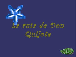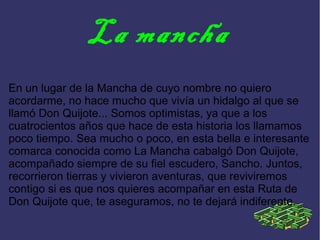 La ruta de Don Quijote recorre La Mancha, donde Don Quijote y su fiel escudero Sancho cabalgaron y vivieron aventuras. Algunos lugares importantes incluyen Alcalá de Henares, donde nació el autor Miguel de Cervantes; Toledo, donde se encuentran los molinos de viento que enfrentó Don Quijote; y Ciudad Real, cerca del parque arqueológico de Alarcos. El documento también proporciona una lista de otras poblaciones relacionadas a lo largo de la ruta.