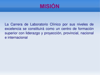 La carrera de Laboratorio Clínico en la Universidad Técnica de Ambato tiene como misión convertirse en un centro de excelencia a nivel provincial, nacional e internacional formando licenciados líderes y competentes con pensamiento crítico y visión humanista, aplicando y promoviendo el conocimiento a través de la docencia, investigación y vinculación para responder a las necesidades de la provincia y el país.
