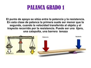 El documento describe diferentes tipos de máquinas simples como palancas, planos inclinados, cigüeñales, tornos, engranajes, poleas, tornillos sin fin y levas. Explica que las palancas se clasifican en tres grados dependiendo de la ubicación relativa del punto de apoyo, la fuerza y la resistencia. También proporciona ejemplos breves de cómo se usan estas máquinas simples comunes.