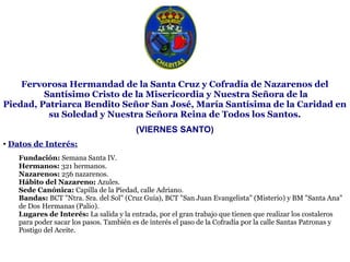 La hermandad fundada en el siglo XX realiza su procesión el Viernes Santo. Cuenta con 321 hermanos y 256 nazarenos vestidos de azul. Sus pasos representan al Cristo de la Misericordia, la Virgen de la Piedad y María Santísima de la Soledad. La procesión dura varias horas siguiendo un detallado itinerario por el centro de Sevilla con paradas en varias iglesias y plazas importantes.
