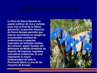 La flora de Sierra Nevada se caracteriza por su riqueza y variedad, albergando 66 especies vegetales endémicas, la mayor biodiversidad de la Península Ibérica. Tras la última glaciación, Sierra Nevada sirvió de refugio para muchas especies. El Parque Nacional Sierra Nevada se encuentra entre las provincias de Granada y Almería y comprende diversos paisajes como La Alpujarra y el Valle de Lecrín.