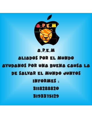 Este documento presenta información sobre la Fundación AAA...PPP...EEE...MMM (A.P.E.M), incluyendo los nombres, cargos, datos de contacto del Presidente Josemiguel Franco y el Vicepresidente Juan Gomez. Además, invita a apoyar a A.P.E.M en su misión de ayudar a salvar el medio ambiente y el planeta para un mejor futuro.