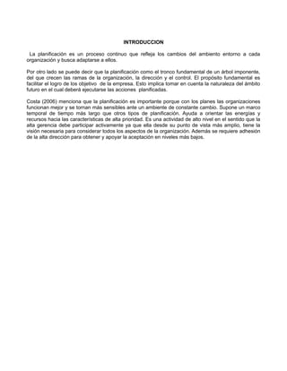 Este documento trata sobre la planificación como función administrativa. Explica que la planificación es un proceso continuo que refleja los cambios del entorno y busca adaptarse a ellos. Luego describe los conceptos de planificación, sus tipos, características, fases e importancia. Finalmente, detalla los diferentes tipos de planes como objetivos, políticas, procedimientos, métodos y presupuestos.
