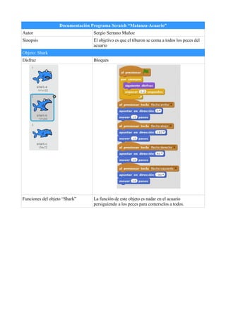 Este programa Scratch simula un acuario donde un tiburón persigue peces para comérselos, mientras los peces intentan huir del tiburón y evadirlo. El tiburón nadará por el acuario persiguiendo a los peces, y los peces tratarán de escapar del tiburón moviéndose en otras direcciones cuando éste se acerque. El fondo del acuario proporciona el escenario para que los objetos se muevan y cumplan sus objetivos.