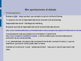 Este documento contiene varias aportaciones de diferentes personas sobre el tema de la responsabilidad social corporativa de las empresas. Algunas personas expresan escepticismo sobre si las acciones de responsabilidad social son verdaderas o simplemente estrategias de marketing. Otras discuten ejemplos específicos de cadenas hoteleras y sus prácticas, como el uso de paraísos fiscales. En general, el documento explora diferentes perspectivas sobre el alcance y la sinceridad de las iniciativas de responsabilidad social corporativa.