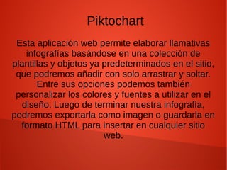 El documento describe 5 herramientas web para hacer infografías: Piktochart, Infogr.am, Easel.ly, Visual.ly y Creately. Piktochart y Easel.ly permiten crear infografías usando plantillas predeterminadas. Infogr.am permite crear infografías desde cero usando propios datos. Visual.ly permite crear infografías rápidas sobre tendencias en redes sociales. Creately es una herramienta para crear diagramas pero también se puede usar para infografías.