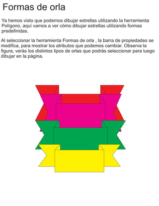 El documento describe tres herramientas de formas en un programa de dibujo: la herramienta Formas de flecha, que permite seleccionar formas de flechas predefinidas; la herramienta Formas de orla, que ofrece opciones de estrellas y otros bordes; y la herramienta Formas de notas, que proporciona varios tipos de notas que se pueden dibujar. Cada herramienta muestra atributos personalizables en la barra de propiedades al ser seleccionada.