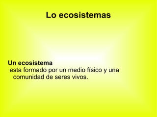 El documento habla sobre los ecosistemas, la nutrición en los ecosistemas, el medio ambiente del ser humano y la responsabilidad tanto de los individuos como de las autoridades en la protección del medio ambiente. Los ecosistemas están formados por un medio físico y organismos vivos, en los que existen organismos productores y consumidores. El medio ambiente humano incluye todo lo que afecta a la vida de las personas. Tanto los ciudadanos como los gobiernos deben trabajar juntos para defender el medio ambiente.
