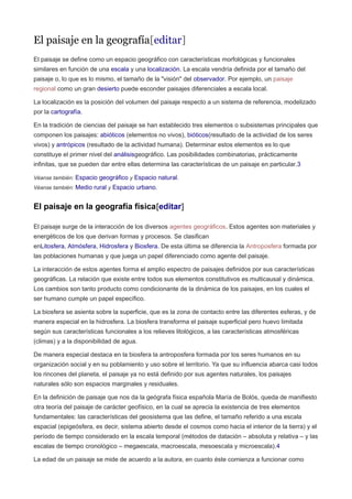 El documento describe diferentes perspectivas del concepto de paisaje en varios campos como la geografía, el arte y la literatura. En geografía, el paisaje se define como un espacio con características morfológicas y funcionales similares determinadas por factores naturales, biológicos y humanos. El paisaje también es objeto de protección legal debido a su importancia ambiental.