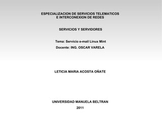 Este documento describe cómo instalar y configurar un servicio de correo electrónico en Linux Mint utilizando los servidores Apache, Bind y Postfix. Primero se instala Apache para el servicio web, luego Bind para el servidor DNS y configurar el dominio. A continuación, se instala Postfix para el transporte de correo y configurar el archivo main.cf. Luego se instala Squirrelmail para el acceso webmail y crear usuarios de correo. Finalmente, se prueba el envío de correo entre usuarios para verificar que el servicio funciona correctamente.