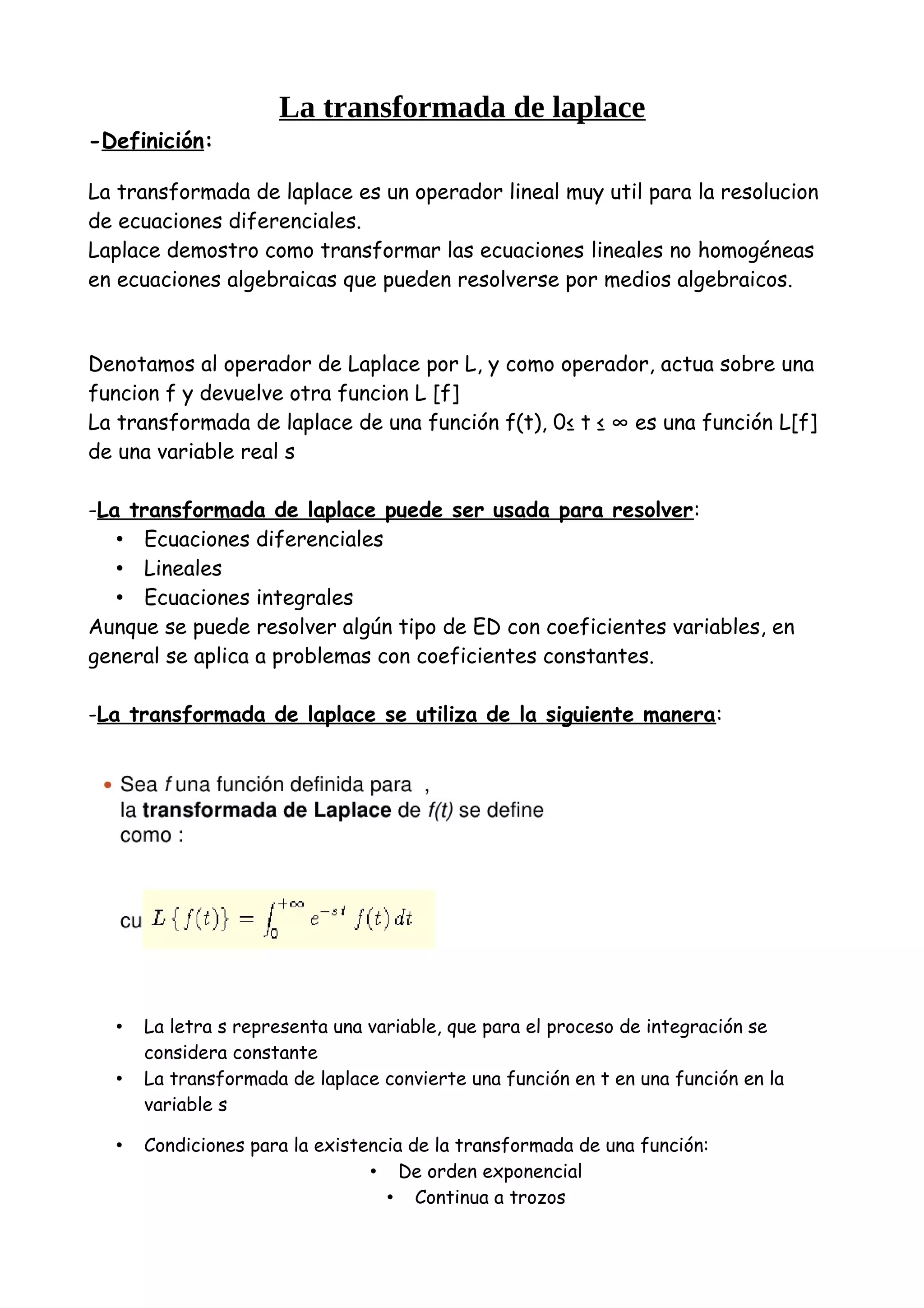 La transformada de Laplace es un operador lineal que transforma ecuaciones diferenciales en ecuaciones algebraicas, permitiendo resolver problemas con coeficientes constantes. Se define la transformada de Laplace de una función f(t) como una función L[f] de la variable s, convirtiendo una función en t a una función en s. La transformada de Laplace se puede usar para resolver ecuaciones diferenciales y integrales lineales, y su transformada inversa permite hallar la solución original buscada.