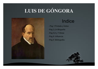Luis de Góngora fue un poeta español del Siglo de Oro nacido en 1561 en Córdoba. Estudió en la Universidad de Salamanca y recibió órdenes menores aunque no llegó a graduarse. Más tarde obtuvo un cargo eclesiástico en la catedral de Córdoba. Fue conocido por sus innovaciones en el estilo poético con obras como las Soledades que introdujeron un lenguaje más complejo y culto. Aunque controvertido en su época, tuvo influencia en generaciones posteri